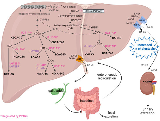 - Barbier, O.; Trottier, J.; Kaeding, J.; Caron, P.; Verreault, M. Lipid-activated transcription factors control bile acid glucuronidation. Mol. Cell Biochem. 2009, 326, 3–8. [Google Scholar] [CrossRef] [PubMed]