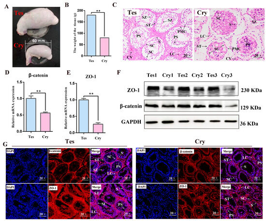 Comparison of appearance and pathology of normal testis and cryptorchidism in yak. (A,B) Testes weights, ** p < 0.01. (C) H&E staining, magnification of 20×. (D) mRNA expression of β-catenin in normal testis and cryptorchidism of yak. Values represent mean ± SD; n = 3, ** p < 0.01. (E) mRNA expression of ZO-1 in normal testis and cryptorchidism of yak. Values represent mean ± SD; n = 3, ** p < 0.01. (F) Protein expression of β-catenin and ZO-1 in normal and cryptorchid testes of yaks. (G) Localization of β-catenin and ZO-1 proteins in yak testes, analyzed by immunofluorescence staining. β-catenin and ZO-1 in tissue are shown separately in red and nuclei are colored blue; magnification, 20×. Tes: normal testis; Cry: cryptorchidism; S: spermatogonium; SZ: spermatozoa; ST: seminiferous tubule; PS: primary spermatocyte; SC: Sertoli cell; LC: Leydig cell, PMC: peritubular myoid cell; CV: capillary vessel.