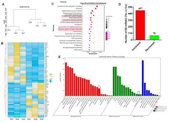 Functional annotation and enrichment analyses in normal testis and cryptorchidism. (A) Cluster analysis of six samples. (B) Clustering heatmap of differential mRNA expression. (C) KEGG pathway analysis of source genes of differential mRNAs. (D) Number of DE mRNAs, with red indicating upregulation and green indicating downregulation. (E) GO enrichment analysis of DE mRNAs. Tes: normal testis, Cry: cryptorchidism.