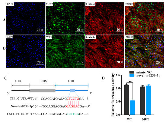 Targeting relationship between target gene CSF1 and novel-m0230-3p. (A) IF staining identified isolated yak SCs using antibodies against SOX9 (green) and β-tubulin (red); magnification, 20×. (B) Immunofluorescence staining identified isolated yak SCs using antibodies against WT1 (green) and β-tubulin (red); magnification, 20×. (C) Binding site of CSF1 and novel-m0230-3p. (D) Luciferase activity in SCs after co-transfection with mimics of novel-m0230-3p (100 nM) or mimic NC (100 nM) and pmirGLO-CSF1 3′-UTR-WT (400 ng) or pmirGLO-CSF1 3′-UTR-MUT (400 ng). Values represent mean ± SD; n = 3, ** p < 0.01.