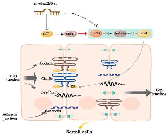 TJs are associated with Occludin, ZO-1, and ZO-2 [43]. Ras is a signal-transducing factor for various membrane receptors and is thought to influence cell adhesion, TJs, and the cytoskeleton via alterations in downstream signaling pathways [44]. A previous study has shown that ZO-1 is localized in vitro in TJs, and this location is regulated by activated Ras [45]. These findings suggest that Ras can modulate the function of ZO-1 to influence TJs [45,46]. Hence, we want to investigate whether TJs in SCs are regulated by novel-m0230-3p through the CSF1-mediated CSF1/CSF1R/Ras signaling pathway. In this study, we found that the mRNA and protein expression of Ras was decreased after the transfection of SCs with mimics of novel-m0230-3p and were increased after the transfection of inhibitor-m0230-3p. Similarly, the expressions of both Occludin and ZO-1 corresponded with that of Ras. These results show that mimics of novel-m0230-3p inhibited the expression of the target gene CSF1, and CSF1 can promote cell TJs by increasing the expressions of Ras, Occludin, and ZO-1 via the CSF1/CSF1R/Ras signaling pathway (Figure 9). These findings suggest that the novel-m0230-3p targeted CSF1 and mediated the CSF1/CSF1R/Ras signaling pathway to inhibit the expression of ZO-1 and Occludin, and both are key proteins of cells and TJs in SCs, resulting in the occurrence of yak cryptorchidism.