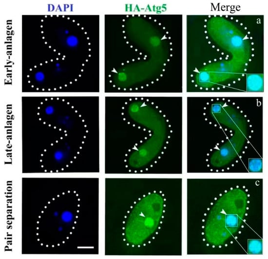 Localization of HA-Atg5 during the sexual reproduction of Tetrahymena thermophila. Cells collected at 6, 8, and 12 h after mixing were fixed and processed for immunofluorescence staining with anti-HA primary and FITC-conjugated secondary antibodies. Cellular nuclei were stained with DAPI to visualize DNA. (a) cells at the early-anlagen stage; (b) cells at the late-anlagen stage; (c) cells at the pair separation stage. Dashed circle represents the cell outline of Tetrahymena. The white arrows point to the paMAC to be degraded. The white box shows a sharp enlargement of the paMAC. Fluorescent images were taken with a DeltaVision deconvolution microscope. Scale bar, 10 µm.