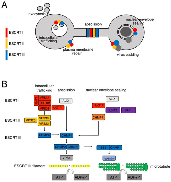 The endosomal sorting complex required for transport (ESCRT) is a machinery composed of protein complexes that contribute to multiple cellular processes, such as cytokinesis [1], endosome maturation [2], neuronal pruning [3,4], the nuclear envelope [5,6], and plasma membrane repair [7,8,9]. In addition, the ESCRT machinery has been implicated in viral replication and budding [10,11,12,13] (Figure 1A). The complexes or groups of the machinery are the ESCRT 0, ESCRT I, ESCRT II, and ESCRT III (Figure 1B). By parallel mechanisms, operated at different sites, the ESCRT 0 and ESCRT I subunits initiate the process mediated by the ESCRT machinery and recruit the ESCRT II complex. The ESCRT II subunits help in the recruitment and assembly of the ESCRT III complex. Eventually, the ESCRT III subunits mediate inverse membrane involution finalizing membrane scission or sealing [14,15,16,17,18].