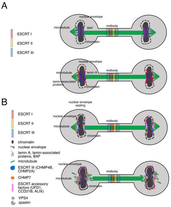 To complete the compartmentalization of the genome at the end of the mitotic process, the nuclear envelope discontinuities, due also to the presence of residual microtubules traversing the nascent rim, are repaired by the ESCRT machinery (Figure 3B). The subunits involved in this process are the ESCRT III CHMP4B and CHMP2A and the specialized nuclear ESCRT II/III hybrid factor CHMP7, along with the ESCRT accessory factors UFD1, CCD21B, and ALIX [5,6,36,164,165,166,167]. VPS4 and spastin complete the process of nuclear envelope sealing by regulating the disassembly of the complexes, acting, respectively, on the ESCRT III and on microtubules [5,157,168].
