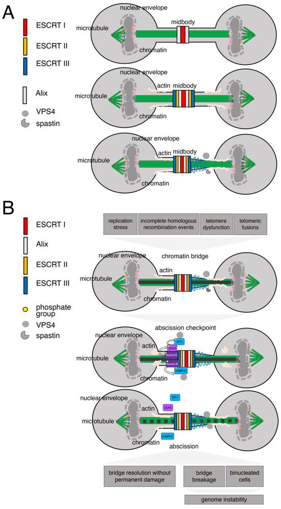 The abscission checkpoint is driven by stresses, among which the most studied is the presence of anaphase chromatin bridges in association with chromosome integrity [215]. Stretches of DNA linking the two daughter cell genomes can be driven by replication defects, by incomplete homologous recombination events, or by telomere dysfunction and telomeric fusions [216,217,218,219,220]. DNA bridges are divided into ordinary and ultrafine. The latter are detected exclusively by staining the associated proteins, while ordinary DNA bridges are visible with conventional DNA staining methods [221,222]. Aurora B localizes at the midbody in response to the presence of these chromatin bridges (Figure 4B). Its recruitment is controlled by the Mre11-Rad50-Nbs1 (MRN) complex, the DNA double-strand break signaling kinase ATM, and its target CHK2 [223]. To revert Aurora B activity and overcome the abscission checkpoint, specialized factors localize at the midbody as RIF1 and PP1γ and PKCε [214,224,225]. The data suggest that RIF1 and PP1γ counteract Aurora B dependent phosphorylation of the ESCRT subunit CHMP4C [224]. The kinase ULK3, whose ESCRT target is IST1, also localizes at the midbody and controls abscission [226].