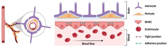 A healthy brain is protected by the BBB, a very specialized and selective barrier system formed by a monolayer of brain microvascular endothelial cells (BMECs), which line cerebral blood flow, as well as brain microvascular pericytes, their basal lamina, and perivascular astrocytes [,] (Figure 1). The barrier controls the entry and the outflow of biological molecules essential for brain metabolism and neuronal functions [,]. As a unique part of the neurovascular unit (NVU), the BBB has a crucial role in maintaining brain homeostasis [] and in protecting the CNS from toxins and pathogen entry []. Hence, functional and structural BBB integrity is pivotal to ensure and preserve the brain microenvironment, mediating CNS communication with the rest of the body [,].
