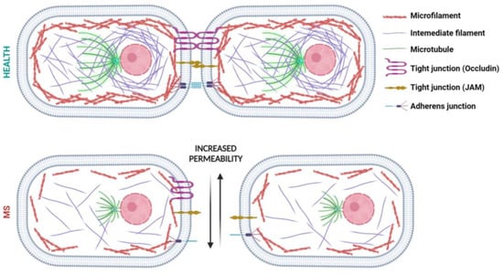 Finally, tubulin cytoskeleton dysfunctions are often described as characteristic features of neurodegenerative diseases, including MS. In normal endothelial cells, the MT system has strongly pronounced convergence in the centrosome region. Near the cell edge, MT density decreases significantly. MS is associated with disturbed MT organization due to stress fibers. The rapid depolymerization and disruption of peripheral MTs are essential early events in the complex mechanisms of endothelial barrier dysfunction. Researchers have proven the hypothesis that the entire system of MTs changes, which means that MTs grow out of the centrosome and become significantly shorter [], as shown in Figure 2 (lower panel). In this regard, Mentor et al. demonstrated that, following treatment with Nocodazole, a MT depolymerizing agent, neuronal endothelial bEnd5 cells exhibit TJ anastomosis misalignments in adjacent cells, failing to establish a well-regulated brain–endothelial barrier [], endorsing MTs’ indispensable role in the maintenance of regulatory permeability across the BBB.