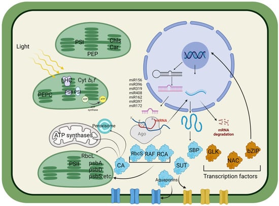 - Pan, J.; Huang, D.; Guo, Z.; Kuang, Z.; Zhang, H.; Xie, X.; Ma, Z.; Gao, S.; Lerdau, M.T.; Chu, C.; et al. Overexpression of microRNA408 Enhances Photosynthesis, Growth, and Seed Yield in Diverse Plants. JIPB 2018, 60, 323–340. [Google Scholar] [CrossRef] [PubMed]