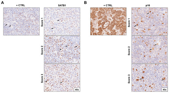 Immunohistochemical staining of (A) SATB1 and (B) p16 in lymph node biopsies of patients with Hodgkin lymphoma according to positivity score (1–3). The positive controls for SATB1 were surrounding lymphocytes; for p16, they were cervix adenocarcinoma cells. Pictures were taken at 40× magnification. Arrows indicate HRS cells. Abbreviations: +CTRL, positive control.