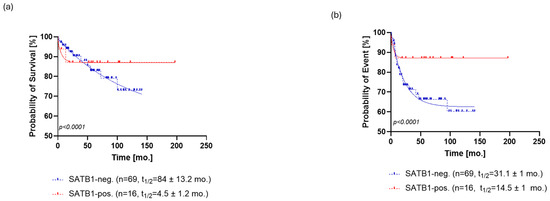 Regarding PFS, SATB1-positive patients relapsed at a rate characterized by a half-life of 14.5 ± 1 months and a probability of relapse settled at the plateau of 87 ± 1%. On the other hand, SATB1-negative patients relapsed at a slower rate with a half-life of 31.1 ± 1 months, eventually reaching a plateau of 62 ± 0.5% probability of relapse (Figure 3a).