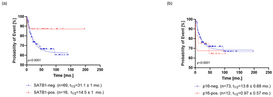 Kaplan–Meier analysis of overall survival (OS) for SATB1 (a) and p16 (b). (a) The OS of SATB1-positive patients was characterized by a population half-life of 4.5 ± 1.2 months and a survival plateau of 87 ± 1%. The SATB1-negative group demonstrated a much longer half-life of 84 ± 13.2 months; however, a survival plateau was not observed during the follow-up; the last survival probability observed was 72% after 12 years of follow-up. (b) Patients positive for p16 staining showed a half-life of 1.4 ± 0.77 months and a survival probability plateau of 75 ± 1.3%. Patients who were negative for p16 exhibited a half-life of 58 ± 6.1 months and the same survival plateau probability of 71 ± 1.4%. Abbreviations: neg., negative; pos., positive, mo., month.
