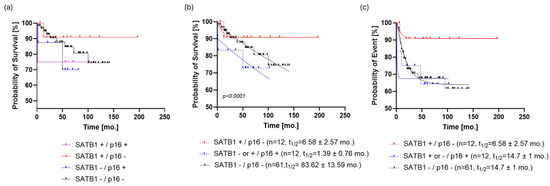 When PFS was analyzed in the same way, it turned out that the SATB1-/p16- and p16+ subpopulations followed the same dynamic (p = 0.7, ΔAIC = −9.672, ER = 1/126), with ta half-life of 14.7 ± 1 months and a plateau of 63.4 ± 0.7%. On the other hand, the PFS curve of the SATB1+/p16- population was almost identical to the OS curve of the same group (Figure 4c).