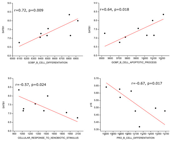 We performed gene set enrichment analysis on publicly available transcriptomic data from the NCBI GEO database and found one data series with eight HL patients (GSE120124, [32]). The SATB1 transcript highly positively correlated with B cell differentiation (r = 0.72; p = 0.009) and moderately with B cell apoptosis (r = 0.64; p = 0.018) genetic signatures; on the other hand, it moderately inversely correlated with response to xenobiotic (r = −0.57, p = 0.024), i.e., detoxification, genetic signatures. P16 expression correlated moderately inversely with the pro B cell differentiation gene expression signature (r = −0.67, p = 0.017) (Figure 5).