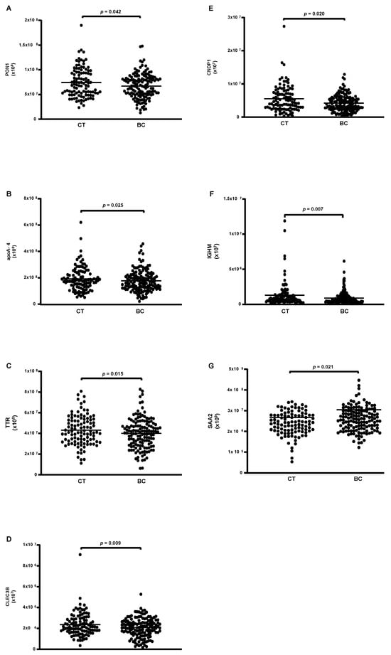 Eighty-eight proteins were associated with HDL particles in both the CT and BC groups. Among these, 26 proteins were quantifiable (Table 5), with 6 showing lower levels in the BC group compared to the CT group (PON1, apoA-4, TTR, CLEC3B, IGHM, and SAA2) (Figure 1A–F), and only 1 exhibiting higher levels in BC compared to the CT group (CNDP1) (Figure 1G).