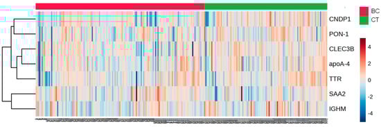 Heat map analysis of HDL proteome in CT and BC cases. HDL was isolated through ultracentrifugation on a discontinuous density gradient (D = 1.063–1.21 g/mL). Five micrograms of HDL protein from individuals with BC (n = 141) and CT (n = 143) were trypsin-digested. Samples were desalted, and after MS, the identified proteins were quantified by DIA proteomics. The heat map was constructed by using MetaboAnalyst 6.0. CT = control; BC = breast cancer.