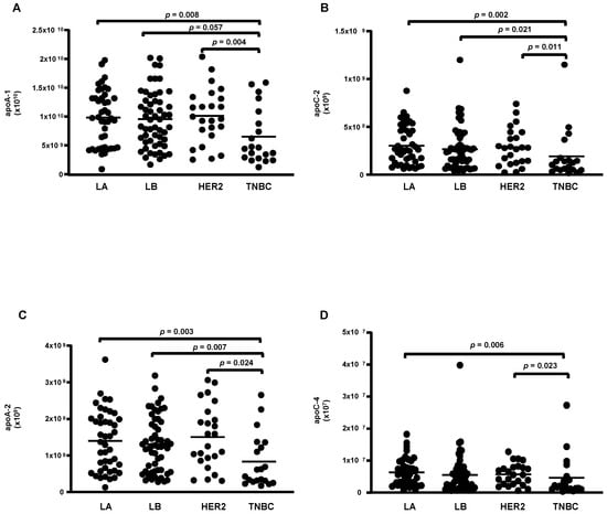 Proteins downregulated in HDL proteomes of TNBC cases. HDL was isolated through ultracentrifugation on a discontinuous density gradient (D = 1.063–1.21 g/mL). Five micrograms of HDL protein from individuals with BC (n = 141) and CT (n = 143) were trypsin-digested. Samples were desalted, and after MS, the identified proteins were quantified by DIA proteomics. Comparisons among the molecular types of BC were made by one-way ANOVA (median and interquartile range 25–75%). LA = luminal A; LB = Luminal B; TNBC = triple-negative breast cancer. (A) apolipoprotein A-1 (apoA-1); (B) apolipoprotein C-2 (apoC-2); (C) apolipoprotein A-2 (apoA-2); (D) apolipoprotein C-4 (apoC-4).