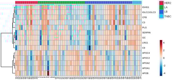 Heat map analysis of HDL proteomes in BC cases according to the molecular type of the disease. HDL was isolated through ultracentrifugation on a discontinuous density gradient (D = 1.063–1.21 g/mL). Five micrograms of HDL protein from individuals with BC (n = 141) and CTs (n = 143) were trypsin-digested. Samples were desalted, and after MS, the identified proteins were quantified by DIA proteomics. The heat map was constructed by using MetaboAnalyst 6.0. LA = luminal A; LB = Luminal B; TNBC = triple-negative breast cancer.