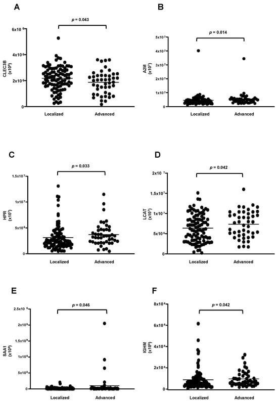 Proteins downregulated and upregulated in HDL proteomes of stages III and IV of BC. HDL was isolated through ultracentrifugation on a discontinuous density gradient (D = 1.063–1.21 g/mL). Five micrograms of HDL protein from individuals with BC (n = 141) and CT (n = 143) were trypsin-digested. Samples were desalted, and after MS, the identified proteins were quantified by DIA proteomics. Comparisons between stages I + II and III + IV were made by the Mann–Whitney test (median and interquartile range of 25–75%). (A) tetranectin (CLEC3B); (B) alpha2-macroglobulin (A2M); (C) haptoglobin -related protein (HPR); (D) lecithin cholesterol acyltransferase (LCAT); (E) serum amyloid A type 1 (SAA1); (F) immunoglobulin Mu heavy chain constant region (IGHM).