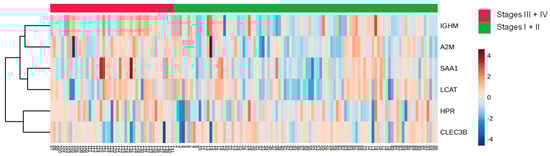 The analysis between the clinical stages of the disease revealed a decrease in the protein CLEC3B (Figure 6A) and an increase in five proteins (A2M; HPR; LCAT; SAA1; and IGHM) in the HDL of women in stages III + IV grouped compared to those in stages I + II (Figure 6B–F). Nonetheless, by ROC analysis, only A2M (AUC = 0.6214; p = 0.0204) and HPR (AUC = 0.6230; p = 0.0187) displayed a good discriminatory capacity between stages of the disease. The heat map depicted in Figure 7 shows differentially abundant proteins in the stages of BC.
