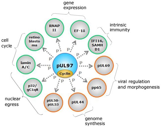 Schematic representation of the HCMV-encoded protein kinase pUL97 and its various substrates. The CDK-like protein kinase pUL97 of human cytomegalovirus interacts with cyclins and phosphorylates (P), as well as a number of viral (encircled in orange) and cellular (encircled in green) substrate proteins. Functional assignment of the individual proteins is indicated by curly brackets. RNAPII, cellular RNA polymerase II; EF-1δ, translational elongation factor 1δ; IFI16, interferon-inducible protein 16; SAMHD1, SAM domain and HD domain-containing protein 1; pUL69, pp65, pUL44, pUL50, pUL53, cytomegaloviral early proteins with specific regulatory functions; p32/gC1qR, acidic 32-kDa multiligand-binding protein as a receptor for globular head domain of complement C1q; lamin A/C, human nuclear lamin protein of types A and C; Rb, human retinoblastoma protein.