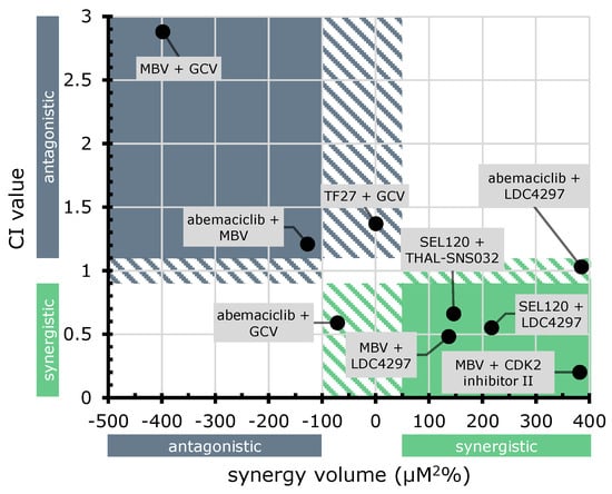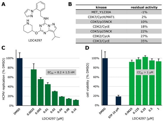 - Wild, M.; Hahn, F.; Brückner, N.; Schütz, M.; Wangen, C.; Wagner, S.; Sommerer, M.; Strobl, S.; Marschall, M. Cyclin-Dependent Kinases (CDKs) and the Human Cytomegalovirus-Encoded CDK Ortholog pUL97 Represent Highly Attractive Targets for Synergistic Drug Combinations. Int. J. Mol. Sci. 2022, 23, 2493. [Google Scholar] [CrossRef]