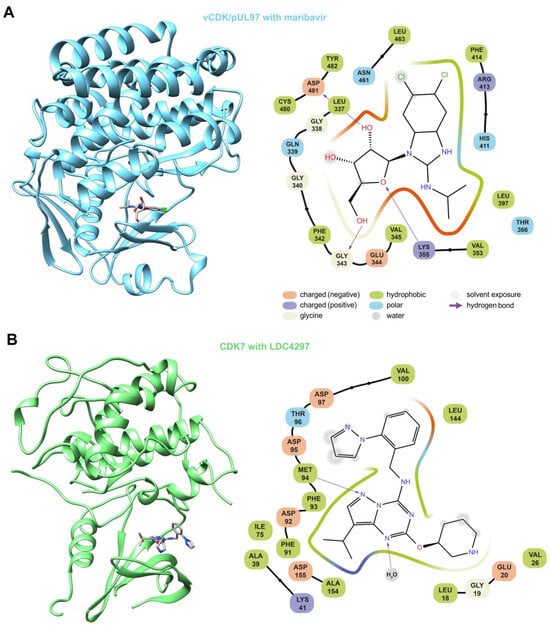 - Schütz, M.; Cordsmeier, A.; Wangen, C.; Horn, A.H.C.; Wyler, E.; Ensser, A.; Sticht, H.; Marschall, M. The Interactive Complex between Cytomegalovirus Kinase vCDK/pUL97 and Host Factors CDK7-Cyclin H Determines Individual Patterns of Transcription in Infected Cells. Int. J. Mol. Sci. 2023, 24, 17421. [Google Scholar] [CrossRef] [PubMed]