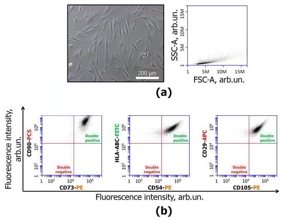 ASC52telo characterization: (a) Left—representative image of MSCs with fibroblast-like morphology, phase contrast microscopy, bar-100 µm. Right—SSC-A/FSC-A distribution of MSCs; (b) cell surface markers on MSCs. MSCs were positive for CD90-PC5, CD73-PE, HLA-ABC-FITC, CD54-PE, CD105-PE, and CD29-APC. Flow cytometry, representative histograms. n ≥ 4.