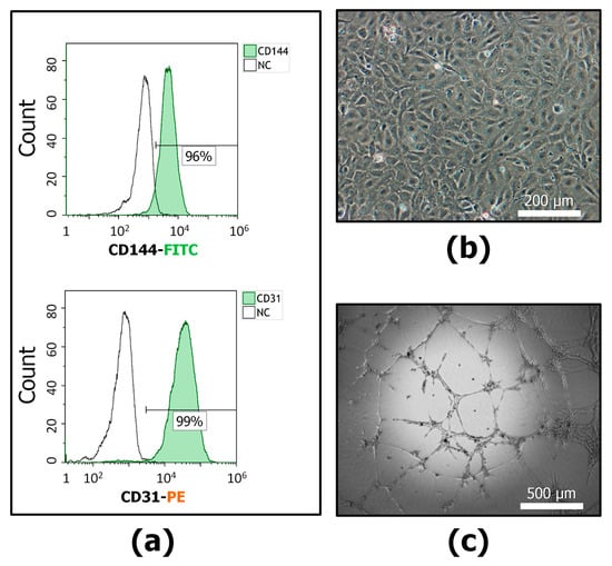 The EA.hy926 (endothelial cell culture, ECs) characterization: (a) Representative flow cytometric plots of EC immunophenotype. ECs were positive for CD144-FITC and CD31-PE (green color is positive cells). NC is an unstained control. (b) Representative image of ECs, phase contrast microscopy, bar-200 µm. (c) Capillary-like structures (tubes) in “matrigel” formed by EA.hy926 cells, phase contrast, bar-500 µm. n ≥ 4.