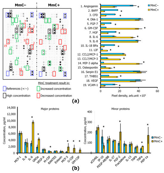 The content of more than 100 different cytokines in the conditioned medium was assessed using dot blots (Human XL Cytokine Antibody Array, R&D Systems Inc., Minneapolis, MN, USA). Treatment with MmC resulted in a more than twofold increase in the level of seven proteins (MIP-3, GM-CSF, LIF, CCL7, IL-6, Thrombospondin-1, and Osteopontin). Concurrently, the concentration of MIP-3 exhibited a more than 10-fold increase. Conversely, the levels of seven proteins (HGF, Angiogenin, Complement Factor D, KGF/FGF-7, VCAM-1, IL-18 BPa, BAFF) were decreased (Figure 4a).