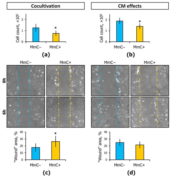 The non-targeted migration of ECs or coculture ECs-MSCs was evaluated in cell monolayers. A decrease in migratory activity was observed in coculture with MmC-treated MSCs, as the wound area decreased more slowly (1.6 times) (Figure 6c and Figure S1a). However, in a monoculture of ECs with the addition of CM, no similar effect was observed (Figure 6d and Figure S1b).