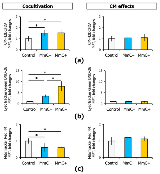 To investigate the lysosomal compartment activity, the accumulation of LysoTracker Green DND-26 in intracellular vesicles with low pH was examined. The activity of the lysosomal compartment in ECs was found to increase by 3.5 times when interacting with “young” MSCs and by eight times when interacting with senescent cells (Figure 7b). Previously, we demonstrated an increased LysoTracker fluorescence in replicative senescent MSCs [35,36]. Some experiments demonstrated an elevated LysoTracker fluorescence after different stress conditions [37]. Interaction with MSCs (both MmC− and MmC+) leads to a decrease in the activity of the mitochondrial compartment in ECs (Figure 7c).