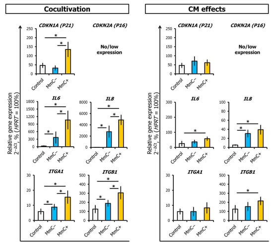 The differential gene expression of CDKN1A (P21), IL-6, IL-8, ITGA1, and ITGB1 in ECs evaluated using q-PCR analysis. The effects of direct cocultivation with senescent MSCs or conditioned medium (CM) from senescent MSCs. Data are shown as mean ± SD; n ≥ 4, * p < 0.05. MmC—mitomycin C, MSCs—mesenchymal stem cells, ECs—endothelial cells, Control—untreated ECs.