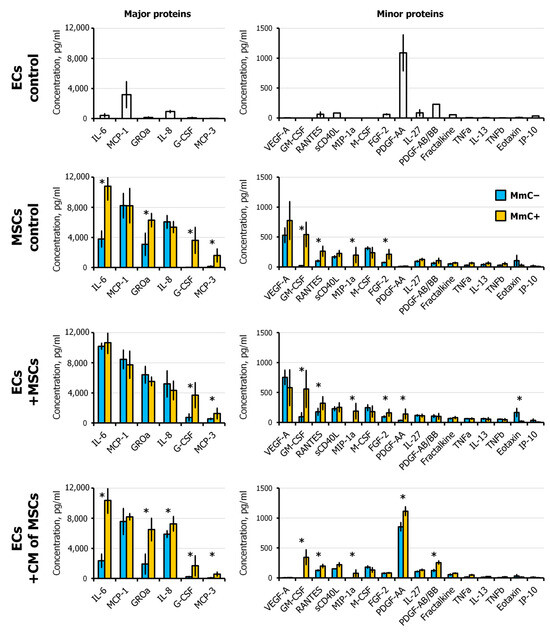 Cytokine concentration in conditioned medium of ECs and MSCs in monoculture, ECs cocultured with MSCs and ECs under conditioned medium from MSCs, evaluated using multiplexed fluorescent bead-based immunoassay. Data are shown as mean ± SD; n ≥ 4, * p < 0.05. MmC—mitomycin C, MSCs—mesenchymal stem cells, ECs—endothelial cells, EC control—monoculture of ECs (untreated), MSC control—monoculture of MSCs (MmC− and MmC+), ECs + MSCs—coculture, ECs + CM of MSCs—CM-treated ECs.
