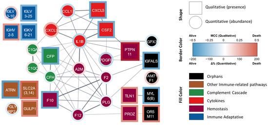 Protein–protein interaction network of proteins significantly related to mortality at four years. STRING-generated network where each node lists the gene symbol or the Ig fraction of the identified proteins. Square nodes represent DAPs identified by the qualitative analysis whereas circle nodes represent the DAPs identified by quantitative analysis. The border color represents the stats value. The fill color represents the assigned functional group: ‘hemostasis’ (purple), ‘cytokine’ (red), ‘complement cascade’ (green), ‘immune adaptive’ (blue), ‘other immune-related pathways’ (brown), and ‘orphan’ (black). A0A075B6K4 (IGLV3-10), A0A0C4DH24 (IGKV6-21), P01717 (IGLV3-25), and P01817 (IGHV2-5) were manually added since they are not included in the STRING database. Abbreviations: Δ%, percent change; MCC, Matthews correlation coefficient (also called the phi coefficient, φ or rφ).