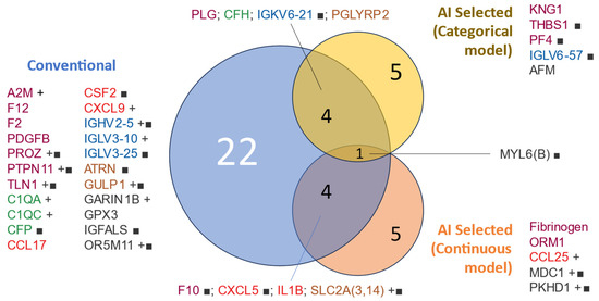 Venn diagram of protein variables used for modeling by selection method. Proteins included in the mortality modeling were selected based on a conventional univariable analysis (t-test/Bernard test) or AI selection. The text color represents the assigned functional group: ‘hemostasis’ (purple), ‘cytokine’ (red), ‘complement cascade’ (green), ‘adaptive immunity’ (blue), ‘other immune-related pathways’ (brown), and ‘orphan’ (black). Protein lists are sorted by group and name. ■: qualitative variable (present/absent), +: higher abundance in non-survivors.