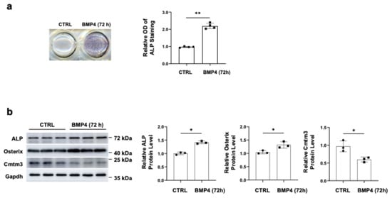 Firstly, we analyzed the expression of Cmtm3 during the osteogenic differentiation of C2C12 cells. ALP staining revealed a significant upregulation in the osteogenic differentiation ability of C2C12 cells treated with BMP4 for 72 h (Figure 1a). Furthermore, the intracellular protein level of Cmtm3 decreased significantly after BMP4 treatment for 72 h in C2C12 cells, accompanied by increased levels of osteogenic differentiation indicators, such as ALP and Osterix (Figure 1b). Collectively, these findings demonstrate the specific downregulation of intracellular Cmtm3 during the transdifferentiation of C2C12 myoblasts into osteoblasts.