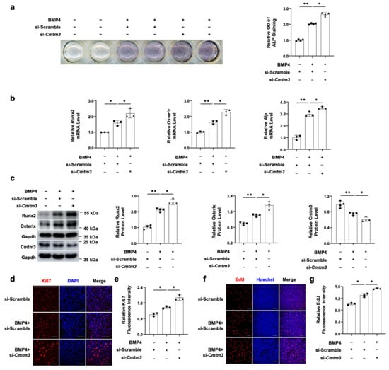 Effect of Cmtm3 knockdown on myoblast proliferation and transdifferentiation of C2C12 myoblasts into osteoblasts in BMP4-induced C2C12 cells. C2C12 cells were transiently transfected with si-Scramble or si-Cmtm3. The transfected cells were differentiated into osteoblast differentiation with BMP4 treatment for 72 h. (a) The ALP activity was determined by ALP staining. (b) The mRNA levels of Runx2, Osterix, and Alp were determined by RT-qPCR. (c) The protein levels of Runx2, Osterix, and Cmtm3 were detected by western blotting. Gapdh was used as a loading control. (d–g) Cell proliferation and DNA synthesis were assessed using Ki67 and EdU staining, respectively. Nuclear staining was performed using DAPI or Hoechst dyes. The fluorescence intensities of Ki67 and EdU were quantified and represented graphically. All data are presented as the mean ± SEM of at least three experiments with at least three replicates in each experiment. ** p < 0.01 and * p < 0.05.
