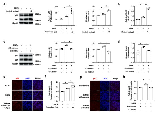Recent research has highlighted the critical roles of both CMTM3 and p53 in tumors, and their relationship has been extensively studied [40,41]. Hence, we hypothesized that the p53 protein might contribute to the regulatory role of Cmtm3 on myoblast proliferation and transdifferentiation of C2C12 myoblasts into osteoblasts. Firstly, we examined the expression of p53 in the absence or presence of Cmtm3. The data revealed that Cmtm3 overexpression significantly upregulated p53 protein expression during BMP4-induced osteogenic differentiation, as well as its downstream regulatory protein p21, a cyclin-dependent kinase inhibitor (Figure 4a). Consistently, Cmtm3 overexpression can also significantly upregulate the mRNA levels of Trp53 during BMP4-induced osteogenic differentiation (Figure 4b). Furthermore, our immunofluorescence result demonstrated that Cmtm3 overexpression could significantly upregulate p53 expression during BMP4-induced osteogenic differentiation of C2C12 myoblasts (Figure 4e,f). Next, siRNA knockdown experiments were conducted to validate the above-described findings. Cmtm3 knockdown significantly decreased the protein expression levels of p53 and p21 during BMP4-induced osteogenic differentiation (Figure 4c). Additionally, Cmtm3 knockdown significantly reduced the mRNA levels of Trp53 during BMP4-induced osteogenic differentiation in C2C12 cells (Figure 4d). Consistent with these findings, immunofluorescence analyses revealed that Cmtm3 knockdown can significantly downregulate p53 levels during BMP4-induced osteogenic differentiation in C2C12 cells (Figure 4g,h). In conclusion, Cmtm3 overexpression positively regulate the levels of p53 and p21 in BMP4-treated C2C12 cells. These results suggest that Cmtm3 regulates myoblast proliferation and transdifferentiation of myoblasts into osteoblasts by upregulating the levels of p53 and p21.