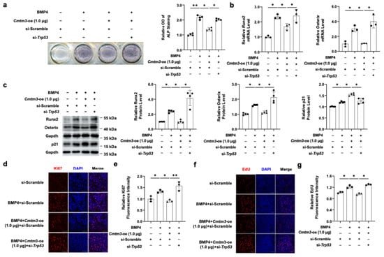 Effect of Trp53 knockdown on the inhibitory effect of CMTM3 in the cell proliferation and osteogenic differentiation of BMP4-treated C2C12 cells. C2C12 cells were transfected with Cmtm3 and si-Trp53 as indicated in combination and treated with BMP4 for 72 h. (a) The ALP activity was determined by ALP staining. (b) The mRNA levels of Runx2 and Osterix were detected by RT-qPCR. (c) The protein levels of Runx2, Osterix, and p21 were detected by western blotting. Gapdh was used as a loading control. (d–g) Cell proliferation and DNA synthesis were assessed using Ki67 and EdU staining, respectively. Nuclear staining was performed using DAPI or Hoechst dyes. The fluorescence intensities of Ki67, and EdU were quantified and represented graphically. All data are presented as the mean ± SEM of at least three experiments with at least three replicates in each experiment. ** p < 0.01 and * p < 0.05 compared to the control group. Scale bar = 100 μm.