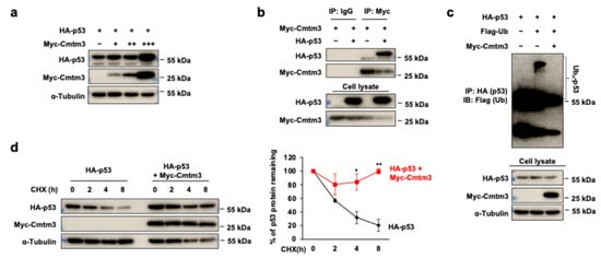 HEK 293 cells were transfected with indicated combinations of HA-p53 and Myc-Cmtm3. After 24 h of incubation, the cells were treated with 40 μg/mL cycloheximide for 0, 2, 4, and 8 h. The harvested cells were subsequently subjected to SDS–PAGE and determined by western blotting.
