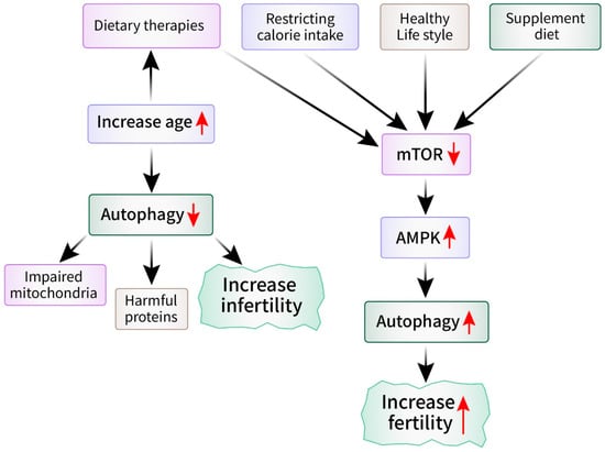 Reproductive aging is an inherent process marked by a gradual decrease in reproductive capacity as individuals grow older, and it impacts both males and females [52]. Although significant focus has been given to the hormonal and physiological transformations that occur throughout this period, recent studies have provided insight into the involvement of autophagy in reproductive aging [53]. A comprehensive understanding of the role of autophagy in the process of reproductive aging could provide valuable knowledge about the fundamental mechanisms that are involved and potential approaches for treatment [54]. The quality of oocytes is a crucial factor in determining fertility and reproductive success in females [55]. Oocytes are more susceptible to age-related deterioration because of the gradual increase in cellular damage. Research has demonstrated that the activity of autophagy declines in oocytes as they age, thus resulting in diminished quality and decreased ability to develop [56]. Impaired autophagy can lead to the buildup of impaired cell structures, such as mitochondria, and harmful clumps of proteins, which can contribute to the aging of egg cells and infertility [57]. The use of pharmacological or genetic methods to increase autophagic activity has been proposed as being a viable technique to enhance oocyte quality and fertility in elderly females [58]. The decrease in reproductive capacity due to aging is affected not only by internal factors but also by external factors such as lifestyle, nutrition, and environmental exposures [59]. Recent research indicates that dietary therapies and lifestyle changes that stimulate autophagy activation may have positive impacts on reproductive aging [60]. Studies have demonstrated that restricting caloric intake, practicing intermittent fasting, and supplementing the diet with chemicals that promote autophagy can increase autophagic activity and enhance reproductive outcomes in animal models [61,62]. Moreover, current research has demonstrated specific molecular pathways and regulatory systems that control autophagy during the process of reproductive aging (Figure 3). Autophagy is controlled by important regulators such as mTOR and AMPK. These regulators have been found to play a role in controlling the function of the ovaries and testes [63]. The exploration of the relationship between these communication routes and autophagy may result in the identification of new treatment targets for age-related loss of reproductive function [64].