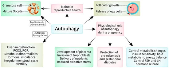 Autophagy has a complex impact on female reproductive physiology, whereby it affects several elements of fertility, pregnancy, and reproductive health [6]. An understanding of the complex relationship between autophagy and reproductive processes has the potential to identify the mechanisms that cause infertility, pregnancy problems, and reproductive disorders [7] (Figure 4). Furthermore, directing attention toward autophagic pathways may demonstrate innovative therapeutic approaches for the treatment of reproductive diseases and the enhancement of reproductive outcomes in women. Additional investigations are necessary to clarify the exact processes and therapeutic possibilities involved in manipulating autophagy in female reproductive disorders. Recently, scientists examined the role of autophagy in the complex processes of female reproductive physiology. This research has provided insights into how autophagy affects fertility, pregnancy, and reproductive diseases [7,70]. Autophagy plays a significant role in oogenesis, which is the process of egg production and a crucial aspect of female reproductive physiology [33]. Autophagy is essential for the growth and maintenance of oocytes, thus ensuring that they mature correctly and are capable of fertilization [71]. Research has shown that when the process of autophagy in oocytes is not properly regulated, it may result in a reduced ability for oocytes to develop normally and increased vulnerability to abnormalities [72]. This can potentially cause infertility or difficulties during pregnancy.