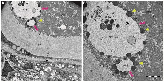 Transmission electron microscopy (TEM) images providing direct visual evidence of the autophagic process occurring within the oocyte cytoplasm. (A) The ultrastructure of an ovary from a rat shows the presence of autophagosomes (pink arrows) within the cytoplasm of an oocyte, which appears to be a protective mechanism after in utero treatment with acrylamide. (B) A higher-magnification microphotograph of the image in Figure (A) reveals large autophagosomes (APS) engulfing extracellular material. These autophagosomes are surrounded by many lysosomes (yellow arrowheads) at different stages of fusion, forming autophagolysosomes. APS: autophagosomes; G: granulosa cells; OOP: ooplasm; ZP: zona pellucida.