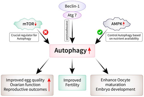 The process of female fertility is complex and controlled by multiple molecular pathways, one of which is autophagy [58,72]. This process is essential for maintaining the balance and functioning of cells. Recently, there has been a growing emphasis on the understanding of the significance of autophagy in female fertility and its potential as a target for therapeutic intervention in diseases associated with fertility. Recent progress has been made in discovering therapeutic targets of autophagy in female fertility and their implications for treatment options [116]. Due to the significant role of autophagy in female reproductive physiology, a focus on this pathway has become a promising strategy for addressing infertility and associated diseases. Multiple recent studies have demonstrated specific targets within the autophagy pathway that could be utilized for reproductive treatment [53,58]. An example of a target is mTOR, which is a crucial regulator of autophagy and is responsible for controlling cellular development and metabolism. Preclinical studies have demonstrated that suppressing mTOR enhances autophagy and leads to improved egg quality, ovarian function, and reproductive outcomes [117]. AMPK is a cellular energy sensor that controls autophagy based on nutrient availability. AMPK activation has been shown to induce autophagy and enhance oocyte maturation and embryo development [118,119] (Figure 6). Furthermore, it has been suggested that manipulating the expression or function of autophagy-related genes, such as Beclin-1 and Atg7, could be a method to improve fertility in women who are undergoing assisted reproductive technology (ART) [120]. Moreover, recent findings indicate that the disruption of autophagy may play a role in the development of certain fertility problems, such as polycystic ovary syndrome (PCOS), endometriosis, and premature ovarian insufficiency (POI) [121,122]. The targeting of the autophagy mechanisms associated with these diseases could provide new treatment strategies for controlling infertility in affected individuals [123]. Moreover, more investigations are required to clarify the exact mechanisms through which autophagy controls female fertility and to discover other therapeutic targets within this system. The effective translation of these results into clinical practice and the development of autophagy-based medicines for infertility will require collaborative efforts among fundamental scientists, doctors, and pharmaceutical businesses.