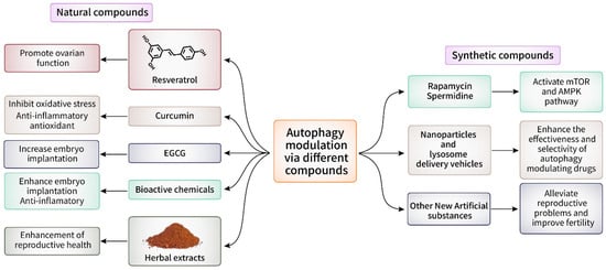 Autophagy modulation via natural and synthetic compounds. Both natural and synthetic compounds play a significant role in autophagy modulation. Natural compounds like resveratrol, curcumin, EGCG, bioactive chemicals and herbal extracts have numerous positive impacts on autophagy modulation including promotion of ovarian function, inhibition of oxidative stress, and enhancement of female reproductive health. They also possess anti-inflammatory, antioxidant, and hormone-modulating properties. One the other hand, synthetic compounds like rapamycin, spermidine, and other new artificial substances with their carriers (nanoparticles and lysosome) activate mTOR and AMPK pathways, lessen reproductive problems, and improve fertility by enhancing the effectiveness and selectivity of autophagy-modulating drugs.