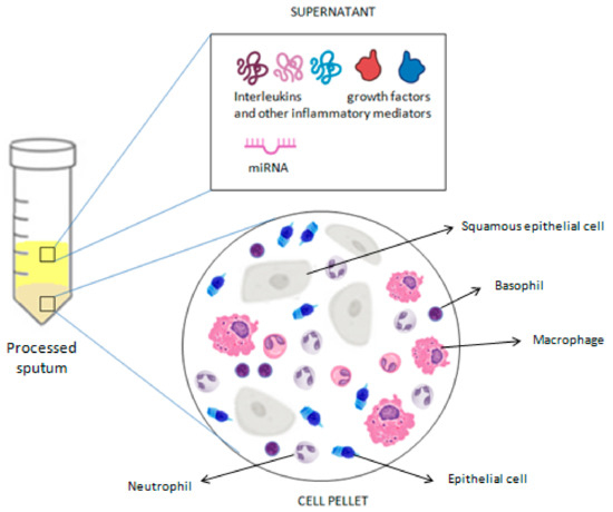 Additionally, the analysis of induced sputum supernatant has proven to be a powerful research tool, shedding light on a wide range of respiratory conditions. In the context of asthma research, it allows the exploration of numerous biological markers of airway inflammation and specific immune responses, providing valuable insights into the pathogenesis, severity, and treatment response of asthma [41,48]. Among the main biomarkers studied in induced sputum for asthma are cytokines and inflammatory mediators. The presence and concentration of proteins such as eosinophilic granule protein-2 (EG-2), granulocyte-macrophage colony-stimulating factor (GM-CSF), tumor necrosis factor-alpha (TNF-α), and interleukin (IL)-8 have been correlated with airway inflammation and asthma severity [15,49,50]. These measurements are generally performed using the immunoenzymatic method. However, DTT may interact with commercial ELISA kits or alter the three-dimensional structure of proteins dissolved in mucus, thus limiting the measurement of soluble mediators in induced sputum. Previous studies of induced sputum from asthmatics have shown that processing with DTT may decrease detectable concentrations of myeloperoxidase (MPO) and eosinophilic peroxidase and increase concentrations of eosinophil cationic protein (ECP), but it does not seem to have any effect on IL-5 or IL-8 levels [34,35,51]. Over the past decade, the combination of electrophoretic/chromatographic methods and mass spectrometry has gained growing interest in the identification of proteins whose levels change in the sputum of patients with asthma. Using the mass spectrometry technique, Lee et al. [52] found that the expression of S100 calcium-binding protein A9 (S100A9) was significantly increased in the sputum of severe uncontrolled asthmatic patients compared to controlled ones and was associated with neutrophilic inflammation. According to Takahashi et al. [53], different expressed proteins in induced sputum could make it possible to distinguish between a smoking and ex-smoking severe asthma phenotype. Tariq et al. [54] found that proteins associated with gastro-oesophageal reflux disease were three- and ten-fold more prevalent in the sputum of severe asthmatics compared to that of mild/moderate asthmatics and healthy controls. In addition to cellular markers and cytokines, research has also focused on gene expression and microRNA (miRNA) profiling in induced sputum from asthmatic individuals. These small RNAs have been identified as key regulators of gene expression and may be implicated in asthma pathogenesis. Several studies have revealed specific miRNA expression patterns associated with the severity and phenotype of asthma, thus providing valuable insights into the underlying biology of the disease and opening new avenues for the development of targeted and personalized therapies [55,56,57,58,59,60,61,62]. Gomez et al. [55] identified hsa-miR-223-3p as the highest expressed microRNA in the sputum of asthmatics with increased neutrophil counts, thus suggesting that it is a key regulator of the TLR and Th17 pathways. Li et al. [57] linked an up-regulation of miR-9 to the mechanism of steroid resistance in asthma. According to Zhang et al. [58], a decreased expression of miR-221-3p in sputum may protect asthma patients against eosinophilic airway inflammation. Lacedonia et al. [59] found that miRNA-145, a key regulator of airway smooth muscle (ASM) function, is higher in the sputum of asthma patients compared to those of patients with different obstructive diseases. Malmhäll et al. [60] suggested a possible role of miR-155 expression in allergen-induced eosinophilic inflammation as its expression was decreased in the sputum of allergic asthmatics during the pollen season. According to the suggestive hypothesis of Song et al. [61], an up-regulation of lncRNA-NEAT1 and a down-regulation of miR-128 in the sputum of children with bronchial asthma may promote airway smooth muscle remodeling. Briefly, understanding the patterns of gene expression and miRNA in sputum could lead to the development of new therapeutic approaches for asthma, aimed at modifying the specific pathogenetic pathways identified through these molecular analyses. The analysis of sputum cellular composition, along with the assessment of molecular markers, provides an in-depth understanding of asthma pathogenesis and severity, offering fundamental data to personalize therapies and develop new targeted treatments, thereby improving clinical management and the quality of life of asthmatic patients (Figure 4).