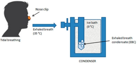 Exhaled breath condensate (EBC) is a non-invasively obtainable biological matrix resulting from the condensation of epithelial lining fluid, useful for studying pathological processes in the airways [8]. The exhaled air leaving the mouth has a temperature of about 35 °C and a humidity of 95%. Exhaled air is almost entirely in equilibrium with water vapor at body temperature. When the exhaled air impacts a surface cooler than the temperature of water vapor, condensation occurs. Therefore, EBC is a liquid matrix essentially composed of condensed water vapor [63] (Figure 5).