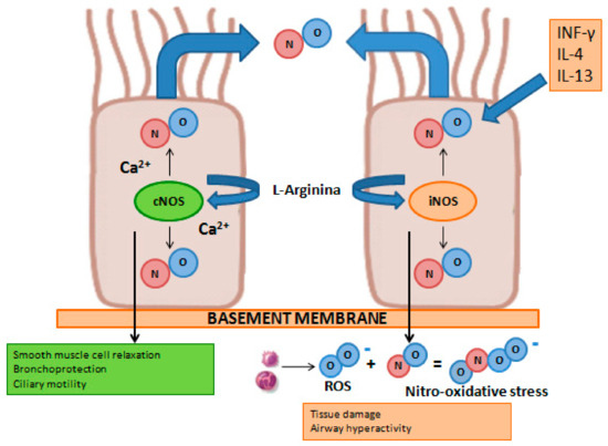 Nitric oxide (NO) is a gaseous compound with a very short half-life (i.e., equal to approximately 4 s), can penetrate through the cell membrane, and acts as an endogenous mediator in a broad spectrum of important physiological processes. In the lungs, NO is produced by different cell types, such as epithelial, endothelial, inflammatory, and nervous cells. The synthesis of this compound is entrusted to a group of enzymes belonging to the nitric oxide synthase (NOS) family, which use the amino acid L-arginine as a substrate [103]. There are two functional isoforms of this enzyme: an inducible form (iNOS) and a constitutively expressed form (cNOS). Under physiological conditions, cNOS through a Ca2+-dependent mechanism produces low levels of NO, which takes part in important physiological processes such as lung development, the relaxation of smooth muscle cells, ciliary motility, and the protection of the bronchi from bronchoconstrictor stimuli. In pathological conditions, interleukin-4 (IL-4) and interleukin-13 (IL-13), key cytokines of type-2 inflammation, through the activation of iNOS, increase the production of NO by the bronchial epithelium through a Ca2+-independent process. Part of the nitric oxide produced by iNOS, reacting with the reactive oxygen species produced by inflammatory cells (i.e., macrophages, neutrophils, and eosinophils) present in the airways, causes nitrosative stress, which results in cellular damage, altered protein functionality, and hyperreactivity of the airways [103,104] (Figure 7).