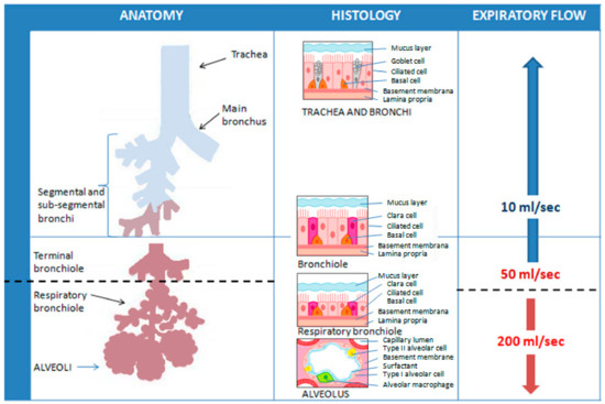 Representation of the theoretical influence of different constant expiratory flows on the sampling of FeNO values at different levels of the respiratory tree. ATS/ERS guidelines recommend an expiratory flow rate of 50 mL/s (FeNO50) as it allows targeting the lower respiratory tract as the region of interest for NO excretion.