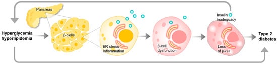 Diabetes mellitus, which encompasses both type 1 and type 2 variants, is a metabolic disease characterized by diverse clinical presentations and disease progression patterns. Type 1 diabetes can be distinguished from type 2 diabetes by several characteristic features: (1) type 1 diabetes typically manifests at an age less than 35 years; (2) individuals with type 1 diabetes often have a BMI less than 25 kg/m2; (3) unintentional weight loss is commonly observed in those with type 1 diabetes, without any prior attempt to reduce weight; (4) at the time of presentation, individuals with type 1 diabetes may exhibit significantly elevated blood glucose levels, exceeding 20 mmol/L (360 mg/dL); and (5) the development of ketoacidosis, a life-threatening complication, is more common in individuals with type 1 diabetes [1]. Clinically, over 80% of diabetes cases are identified as type 2 diabetes mellitus. The dysfunction and reduction in the mass of pancreatic Ξ²-cells are critical factors in the initiation and progression of type 2 diabetes mellitus (Figure 1). This condition is also characterized by chronic hyperinsulinemia as a compensatory mechanism for insulin resistance.